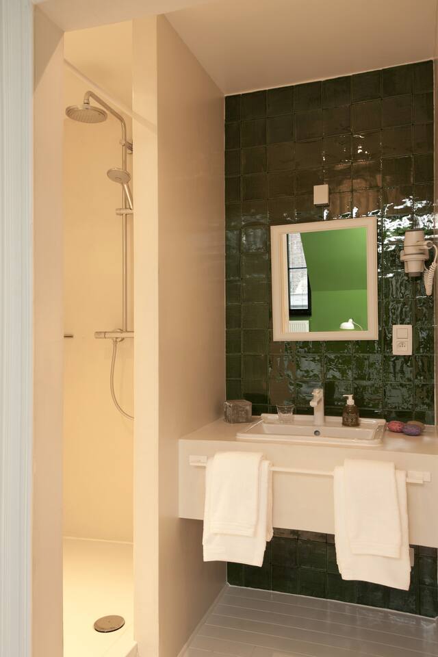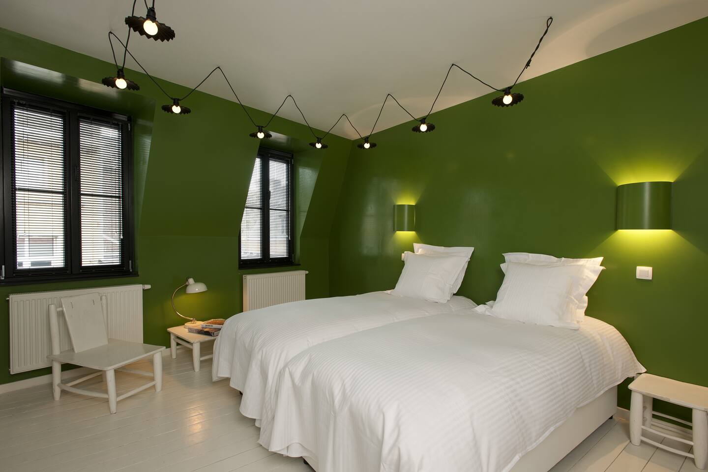 In this room, nature is everywhere. The walls are covered with a green lacquer that calls for serenity and calm. In the middle, the large white bed, a real temptation to laziness, is enthroned, completed by a comfortable reading corner and refined furniture. On the ceiling, we find this luminous and flowery frieze that matches the simplicity of the room. This room has a breathtaking view of the Brussels Palace of Justice. Free Wi-Fi connection is available. The room is located on the third floor without lift.